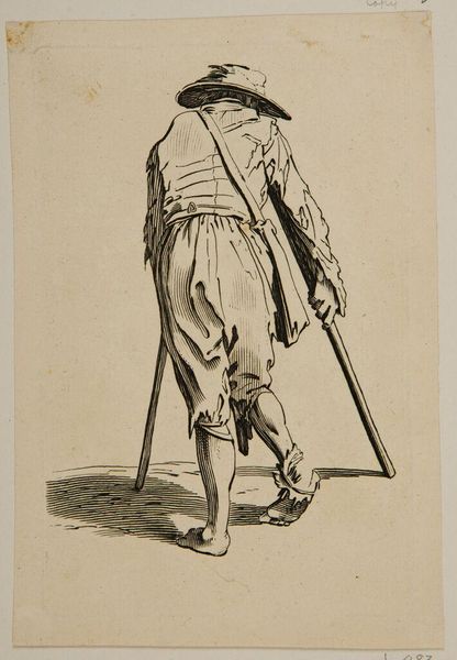 Editor: This engraving, titled "De vagebond," or "The Vagabond," was created sometime between 1639 and 1684 by Aert van Waes. It depicts a lone figure in simple garb. The overall tone is somewhat bleak, but there's a touch of character in the man's eyes. How do you interpret the symbolism in this seemingly simple image? Curator: The figure's attire—the feathered cap, worn boots, simple shirt—immediately speak to a particular socio-economic status. But observe, isn't there a sly knowing in his gaze? It's not merely about poverty, but about a life lived outside conventional norms. The stick across his back also echoes this theme of mobility, or the traveler’s burdens. What of the outbuildings? Editor: They seem very basic. Are they symbolic too? Curator: Indeed. Think of genre painting in this era; such background elements would provide crucial clues as to social roles. Note that the artist included a barely suggested, winding stream and vague, hilly horizons—details suggesting natural and even primordial spaces. So, in my reading, he occupies an intersection, being on the border of human settlement but removed from it, existing freely in nature, but perhaps too, exiled from community. Don’t you wonder if that knowing in the subject’s eye represents recognition of those constraints? Editor: I hadn’t thought of it that way. It's interesting to consider how those specific details contribute to such complex themes of marginalization and freedom. Thanks! Curator: A pleasure. It’s the ongoing dialogue between viewer and artwork which enriches cultural memory and gives continued meaning to our shared past.