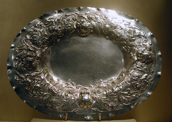 Editor: This is a silver tray crafted by Digby Scott, dating back to 1806 or 1807. It’s so ornate! All that detailed embossing is stunning. And I noticed it’s emblazoned with a coat of arms, belonging to William Burrell. What stories does a piece like this hold? Curator: It's a fascinating example of how objects reinforced social standing. This tray isn't simply decorative; it's a statement. Silver pieces like this functioned within a network of display and exchange, communicating power and wealth. Consider where this object might have been placed, the rituals surrounding its use. Who was William Burrell trying to impress? Editor: That’s a great question. Thinking about its placement… I imagine this in a lavish dining room, or maybe even a place for political discussions. Does the imagery give clues as to what kind of statement he was making? Curator: Precisely. The arms themselves communicate lineage and legitimacy, deeply rooted in a historical and hierarchical system. Silver, in this period, represented stability and inherited status at a time when new wealth was challenging traditional hierarchies. It projects an image of established gentility. Do you think that message resonates today? Editor: That makes sense. I suppose that craving for established gentility continues today in many forms, not always related to silverware, of course! What I thought was "just" decoration actually reveals much about how social and political values are embedded in design. Curator: Indeed. Analyzing these objects is like reading historical texts, albeit in a different language. This exercise highlights that objects such as trays are also an extension of the image we choose to give out. Editor: I never looked at decorative arts that way!