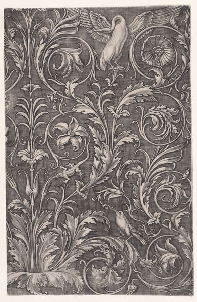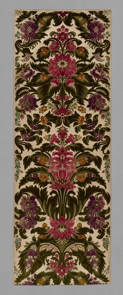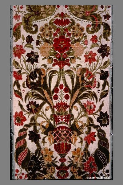 Editor: This textile "Piece," created between 1716 and 1719 and currently residing at the Met, presents a captivating floral pattern. It feels quite formal and imposing. How do you interpret this work? Curator: The formality you observe likely stems from the Baroque period's love of symmetry and ornamentation. Look closely – what do these flowers and swirling patterns evoke for you? Does the repeating motif hold a deeper cultural resonance? Editor: Well, I see repetition and rhythm. Is it just meant to be beautiful or does the symbolism point to a deeper meaning in the 18th century? Curator: Floral motifs, especially during the Baroque, weren't merely decorative. Flowers, like certain colors or mythical creatures, functioned as allegories for social status, moral virtues, and sometimes even hidden political messages. The question is, can we unlock the meanings of *these* specific flowers through the symbolic language of the era? Also, consider what function textiles served at the time: what purpose was this designed for, and for whom? Editor: That's fascinating! It completely shifts my understanding. So, decoding these symbols might give us a glimpse into the values and beliefs of that time. Curator: Precisely. And further reveal what aspects of the past the Baroque artist and patron wanted to keep alive in the cultural memory through daily interaction. A tapestry, in its own way, is a script awaiting interpretation. Editor: I see how analyzing the symbols within such works opens a rich historical conversation, not just aesthetic admiration. Curator: Indeed. Each careful design choice reveals echoes of past values in an object made new.