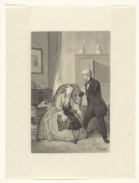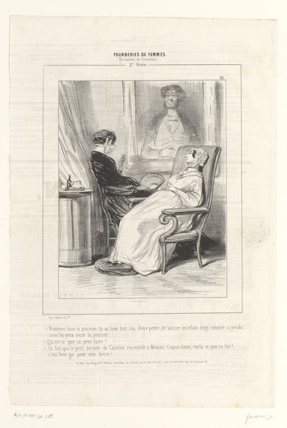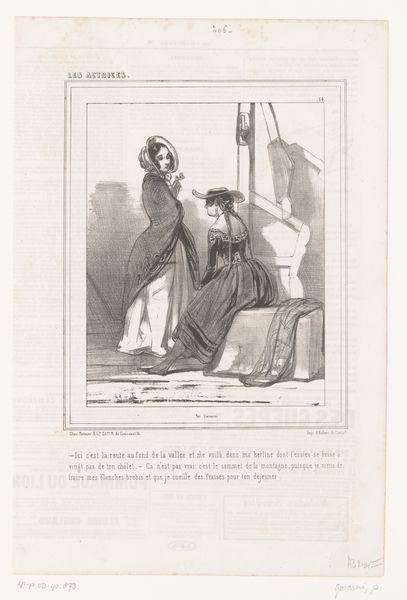 Editor: This lithograph by Paul Gavarni, made in 1840, is called “Man vaart uit tegen zijn vrouw,” which I think translates to “Man complains to his wife.” It looks like a tense domestic scene, with the man quite agitated. What symbols jump out at you? Curator: My eyes are drawn to the averted gaze of the woman. In the history of art, we see the gaze used as a powerful conveyor of meaning – sometimes compliance, other times defiance. Here, her turned head, coupled with the man’s expressive posture, creates a push-pull dynamic. I'm wondering how Gavarni employs caricature here not just to entertain, but to convey psychological tension? Editor: That’s a great point, because he almost looks like he is performing, or maybe accusing. Curator: Indeed. This image operates on multiple levels. Consider how Romanticism, the style attributed to this piece, often deals with heightened emotion and the individual experience. What societal roles do you think Gavarni is highlighting and perhaps critiquing through this scene? Are these timeless struggles or specific to the era? Editor: Well, it looks like a well-dressed couple. Maybe it's a commentary on the roles and expectations within marriage during that time? The text underneath could be further clue about societal expectations. Curator: Exactly. The print originally appeared with text, and prints were made to disseminate information or opinions widely and cheaply, so text becomes vital to its immediate meaning and its interpretation by us, as viewers. I wonder how his audience at the time would have seen it, comparing his dramatic gestures to her quietness? Editor: So much is embedded in what seems like a simple image. Now I’m curious about what the caption really means! Curator: And that’s often the goal – to spark curiosity and encourage us to question the layers of meaning within a work.