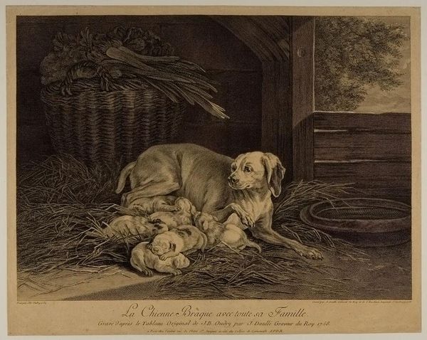 Editor: This is Adolf Eberle’s “In the Dog Stable” from 1883, an ink and pencil drawing. I am really struck by how incredibly detailed this small work is. It feels so intimate and captures a perfect, almost idealized, domestic moment. What draws you in? Curator: Well, firstly, its raw quality speaks to me. Eberle, using the humblest of materials – ink and pencil – turns what could be a simple genre scene into a bustling celebration of life. The pen and ink feels like an act of remembering, a way of pulling the viewer into this one memory. It's a stable teeming not with livestock, but with family, dogs, and children! A cozy chaos. Doesn't it almost feel a little claustrophobic to you? Editor: I see what you mean! There are so many elements packed in, it’s like looking into a memory itself, kind of hazy. Almost overwhelming, in a nice way? Curator: Exactly! And there is something charming in its almost photographically mundane subject matter; though I would argue, is any family with a litter of puppies truly mundane? Tell me, how do you think he manages to capture such intimacy? Editor: Perhaps through the lines themselves? Some areas are much darker than others which directs your eyes to the connection between figures in the composition...the loving glances and playful interactions... it all builds towards intimacy. It's the artist zeroing in on what truly matters. Curator: Beautifully put! A simple scene turned profoundly affecting by nothing but skillful handling of line and depth. Editor: Thanks, I hadn't quite thought about it that way, but I definitely see that now! There's real power in simplicity when done right, huh? Curator: Absolutely. Eberle teaches us that even the simplest materials and scenes can contain the most profound beauty.