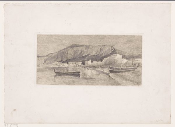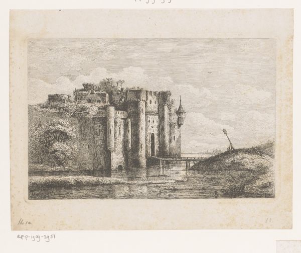 Editor: Here we have Philip Zilcken’s "Avignon. Tour Philippe le Bel," a pencil drawing from 1920. It's quite delicate; I’m drawn to how the tower seems to rise almost ethereally from the landscape. What do you see in this piece? Curator: Immediately, I’m struck by how the tower functions as more than just architecture; it's an embodiment of power, of a specific historical period, but also fragility. The artist's choice of pencil enhances this impression. Does the seeming simplicity of the landscape speak to a deeper psychological dimension, perhaps a reflection on memory and time? Editor: Memory and time, that’s interesting! I hadn't considered it that way. Curator: Look closer at the texture created by the pencil strokes, especially around the tower and the water. Does that visual weight lend itself to ideas related to human impact on the environment? In the presence of historical objects such as this medieval tower, consider their roles as witnesses to the passage of time. How does the rendering style—almost like a faded memory—impact our connection with the past? Editor: So, the delicate style almost becomes symbolic in itself, of memory and the past. I am starting to look beyond the aesthetic of it, and see how the symbolism creates the mood. Curator: Precisely! It makes me consider the ways in which we assign symbolic meaning to these historic spaces. Understanding why and how places accumulate value and sentiment can speak to their power within the public consciousness. Editor: That's given me a completely new way of thinking about how an artist represents a familiar monument. Thank you! Curator: A fresh perspective is always invaluable. It is also rewarding to have identified ways in which art informs culture and influences historical memory.