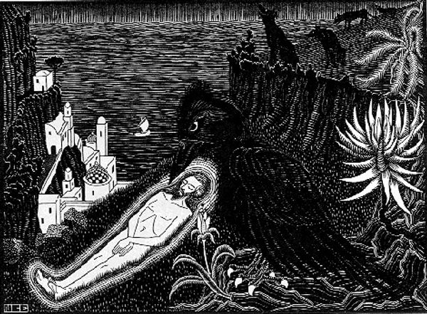 M.C. Escher made "St. Francis preaching to the Birds" as a woodcut, meaning the image is carved from wood. The black and white enforces the design, and you can really see all the individual marks that comprise the image. In the bottom left corner we see a bird which stands alone, seemingly away from the crowd of birds gathered on the left. The bird is in profile, but the eye is still visible, looking off in the direction that St Francis is gesturing. The markings which render the feathers are so intricate and detailed. What is interesting is how the artist uses tone and shape to create the image. Escher’s work reminds me a little of the graphic novel artist Lynd Ward, who also made images by carving wood. Ultimately, the piece demonstrates how an image can be achieved through mark making, carving and inking.