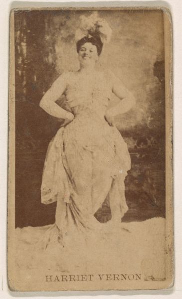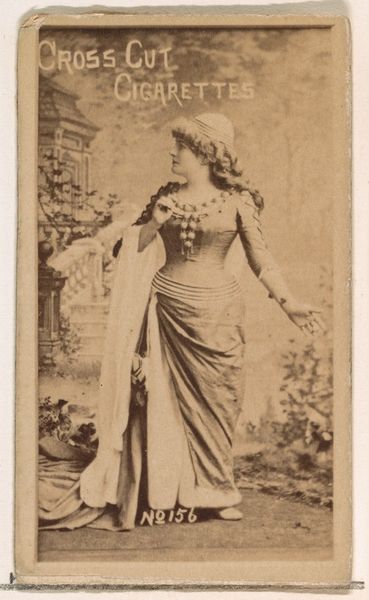 This card of Sophie Gyre, from the Actors and Actresses series, was created by Allen & Ginter for Virginia Brights Cigarettes. The monochromatic image, in shades of sepia, immediately evokes a sense of nostalgia. Sophie Gyre is depicted in what appears to be a theatrical pose, set against a vaguely defined backdrop that suggests a stage or garden setting. The artist's manipulation of light and shadow sculpts the figure, emphasizing the contours of her form and creating a dynamic interplay between the foreground and background. This card, a piece of commercial ephemera, engages with the semiotics of celebrity and desire. The composition and its use of classical motifs invite us to consider the cultural values projected onto these public figures, and the role they played in shaping consumer culture. Consider, as you move on, how such small, mass-produced items can serve as potent cultural artifacts, reflecting the values and desires of their time, and how the semiotic structure and deployment of celebrity imagery contributed to the burgeoning advertising industry.