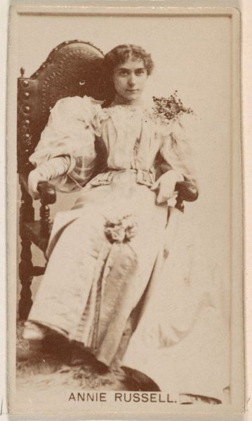Editor: This is an advertisement card from the 1880s for Duke Cigarettes, featuring the actress Marie Burroughs. The image, sepia-toned and delicate, captures Burroughs seated, gazing calmly. What sort of cultural context can we apply to understand this work? Curator: Think about what symbols resonate within us, even unconsciously. The presence of an actress on a cigarette card…it's layered. Consider what Burroughs represented: femininity, performance, aspiration. Then think about what cigarettes symbolized at the time: modernity, leisure, perhaps even rebellion. Do you see how these symbols intertwined to create a potent message? Editor: So, it’s more than just advertising a product? The image itself carries meaning beyond that. Curator: Precisely! Burroughs isn't merely selling cigarettes; she is lending her fame, her beauty, and, by extension, her implied social status, to the product. The floral patterns on her dress and the carved chair she sits on further elaborate the message of refinement and luxury that would speak to its intended consumers. Can you discern anything in her facial expression? Editor: She looks poised and perhaps slightly detached, as if observing from a distance. Is that detachment a reflection of something larger? Curator: Indeed. Think of the late 19th century, a time of burgeoning consumerism. Celebrities like Burroughs became both accessible and unattainable. Her gaze, aloof yet engaging, embodies this tension. It's an invitation, promising that *you*, too, can share in this lifestyle if you partake in Duke Cigarettes. What emotional feeling emanates from her pose? Editor: I see elegance and restraint… a carefully crafted image. Curator: And that crafted image speaks volumes. It reflects the carefully constructed image of the era itself. Think of all that went into this small, mass-produced card—the choices of model, attire, pose, composition, font. And all of it contributing to cultural memory and aspiration. Editor: That's fascinating; it really highlights the complexity hidden within what seems like a simple advertisement. Curator: Exactly. Even something as ephemeral as a cigarette card can act as a portal into a past era, revealing deeper truths about its values and anxieties.