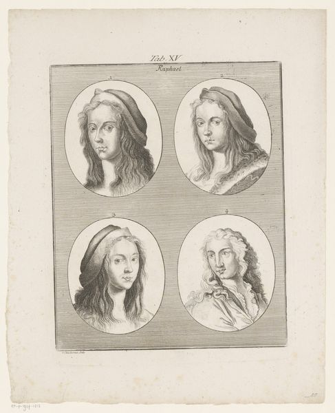 Curator: This drawing, created after 1863 by Jules Armand Hanriot, brings together three fascinating figures. It's entitled "Medaillons met portretten van Armande Béjart, Jean Baptiste Poquelin Molière en Madeleine Béjart" - quite a mouthful, but perfectly descriptive. Editor: It certainly is descriptive! My immediate reaction is a sense of restrained elegance, almost melancholic. The portraits, rendered in pencil, have a beautiful delicacy, a sort of faded grandeur. They almost float against the plain backdrop. Curator: I agree. Hanriot's choice of pencil lends itself well to the classical style of academic art and the sitters have such distinctive personas: the thoughtful repose of Molière, sandwiched between the more severe profiles of the Béjart sisters. Editor: Yes, those profiles! Looking at them, I’m struck by the enduring power of the cameo and medallic forms. They feel archetypal. These portraits of artists become symbols themselves, representations of an era, but also hinting at timeless dramas and societal mirrors—the family and the troupe as interconnected theatrical stages, a web of professional collaboration as well as blood relation. Curator: An excellent point. One sees the almost familial entanglement within the most famous theater company in history...The work invites the observer to interpret more than meets the eye... Editor: I wonder, did Hanriot consider using another medium? A bronze cast would suggest wealth. Oil on panel suggests importance. But with pencil, it suggests an intimate glance into memory and preservation through posterity. A ghostly intimacy permeates from its faded character. Curator: And Hanriot clearly admired them all...The trio had powerful reputations, all earned with the success of their creative company and personal connections and their faces live again through Jules Armand Hanriot´s dedication. The images now provide insight and inspiration through art... Editor: The subtle pencil shading captures each character perfectly, creating both artistic interpretations and powerful social images within cultural memory. Fascinating. Curator: Indeed. I am inspired. Thank you!