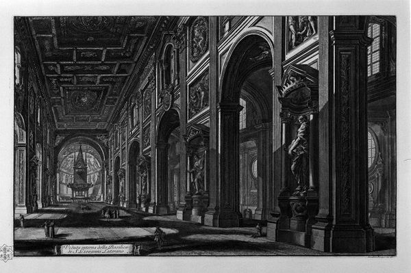 Giovanni Battista Piranesi created this etching of a grand vestibule in Rome in the mid-18th century. Piranesi was known for his dramatic, imaginative depictions of Roman architecture, capturing not just their physical grandeur but also a sense of their historical weight. The etching presents a vast, imposing space, filled with classical columns, arches, and statuary. The play of light and shadow enhances the scene's theatricality. Made during the height of the Grand Tour, when wealthy Europeans traveled to Italy to experience its classical heritage, Piranesi’s prints catered to a growing market for images of Roman antiquity. His work also reflects a broader cultural interest in archaeology and the rediscovery of ancient sites. To fully understand this work, we might delve into the history of 18th-century printmaking, the Grand Tour phenomenon, and the architectural styles popular at the time. Ultimately, this etching reflects how art can shape and be shaped by cultural values.