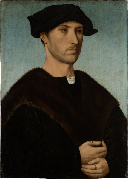 This is Hans Memling's "Portrait of a Man Wearing a High Red Cap," painted in oil on wood. Here, the composition is strikingly simple: the subject dominates the frame, his figure cut off just below the hands. The dark, almost monolithic block of his robe is punctuated only by the fur trim at his neck and the glint of rings on his fingers. This austerity throws the viewer's attention to the face, capped by the vibrant red hat. Memling balances realism with formal constraints. The atmospheric perspective is subtly rendered in the distant landscape, yet the man's gaze is fixed, his expression detached. This interplay between detail and abstraction invites us to consider how the portrait functions, not merely as a likeness, but as a construction of identity. The portrait creates a powerful statement through the controlled use of colour and form. Meaning is crafted through a delicate interplay of presence and absence.