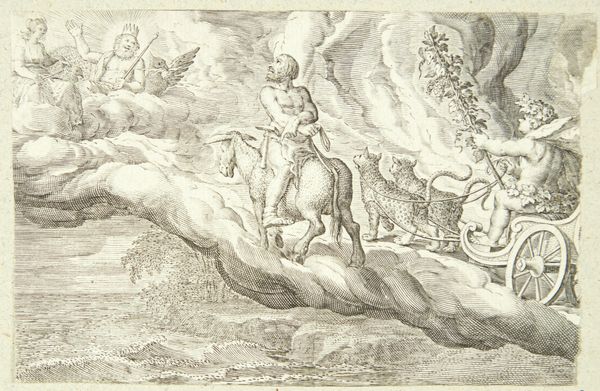 Curator: Here we have "Venus," an engraving by Crispijn de Passe the Elder, though the precise date is unknown. It’s a striking allegorical image. Editor: Indeed, the composition is quite arresting! The contrast between the ethereal Venus in the clouds and the detailed scene below is remarkable. Curator: Precisely. De Passe was a master engraver, and you can see how the lines delineate not just form, but also the textures of the clouds and the landscape. The printmaking process allows for the wide distribution of classical themes to a broader audience. Editor: It’s interesting to consider how this image engages with notions of love, beauty, and terrestrial life. The artist uses line to delineate a range of symbolic meanings, from the constellations above to the bustling activities below. Curator: And consider the labor involved in producing such a detailed print! Each line is a testament to the artisan's skill and the social role of image reproduction at the time. Editor: I'm particularly drawn to the formal balance—the symmetry is exquisite! It invites contemplation about the relationship between the celestial and the earthly. Curator: It definitely offers a fascinating lens through which to consider our own relationship to the classical past and the means of its visual transmission. Editor: A fascinating exploration, indeed, of both form and concept.