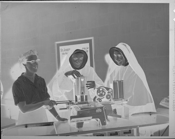 Editor: This is Jack Gould's "Untitled (door to door salesman with electrolux)", a photograph, currently held at the Harvard Art Museums. The inverted tones create a stark, almost ghostly effect. What do you see in the composition? Curator: The formal arrangement strikes me. The photographer plays with light and shadow to create an almost surreal juxtaposition. The salesman's suit, meticulously rendered, contrasts sharply with the domestic space, blurring the boundaries between public and private. Editor: I hadn't considered the blurring of boundaries. It makes me wonder about the narrative implied in the photograph. Curator: Indeed. The stark contrast invites us to consider the relationships between the figures and their respective roles. Editor: I see the contrast more clearly now. Thanks for pointing that out! Curator: My pleasure. Formal analysis allows us a deeper understanding of the artist’s choices and the underlying message.