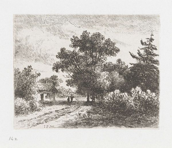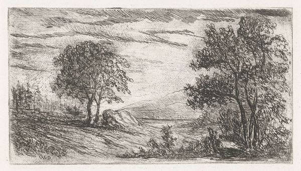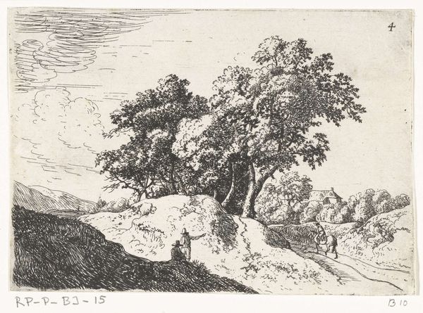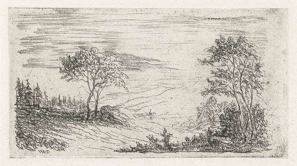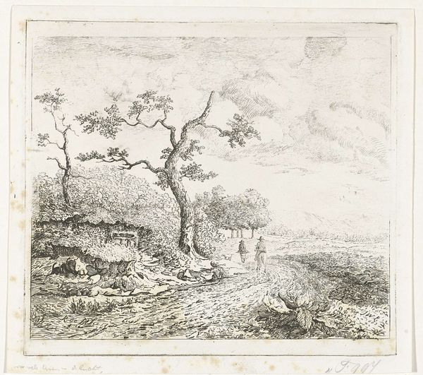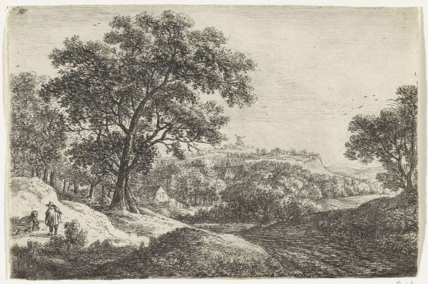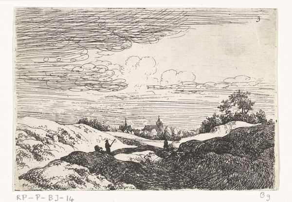 Curator: Let's consider this etching, "Landschap met valkeniers," or "Landscape with Falconers," created around 1845 by Reinierus Albertus Ludovicus baron van Isendoorn à Blois. Etching, of course, being a printmaking technique where lines are incised into a metal plate with acid. Editor: My first impression is one of quiet industry. It's monochrome, incredibly detailed. There's a sense of scale, but also of the figures being dwarfed by the landscape around them. Curator: The artist's handling of line is striking. Look at the way he creates texture and depth with just a few well-placed strokes. The scene depicts figures on horseback – likely falconers, as the title suggests – moving across an open field toward a distant cityscape. I wonder about the role of printmaking in disseminating such imagery during the period. Prints made art more accessible to a wider audience, breaking down class barriers. Editor: Absolutely, and the act of hunting, specifically falconry, was itself loaded with social meaning. It's a display of power and leisure available only to certain social strata. But what's fascinating to me is how the print complicates that narrative. The medium democratizes the *image* of power, even if it can't dismantle the power structures themselves. The landscape itself looks somewhat unforgiving. There are only two figures to control such an immensity. Curator: The detailed rendering of the landscape speaks to a specific moment in our relationship to the natural world as commodity too. Think of the labour involved in its creation too. Editor: Exactly, these visual narratives reinforced cultural norms while, perhaps unintentionally, also exposing the inequalities of the time. In looking, too, there is an engagement to gender in relationship with power. Who hunts, and who, therefore, commissions an image like this, also says a lot. Curator: It truly does. Thinking about it, viewing these images is an act of labor, and a consumption too! Editor: Right, a continual processing and re-negotiating. Examining these prints, we gain insight into the production processes of the art world and social dynamics during that time. It has certainly helped give me another vantage.