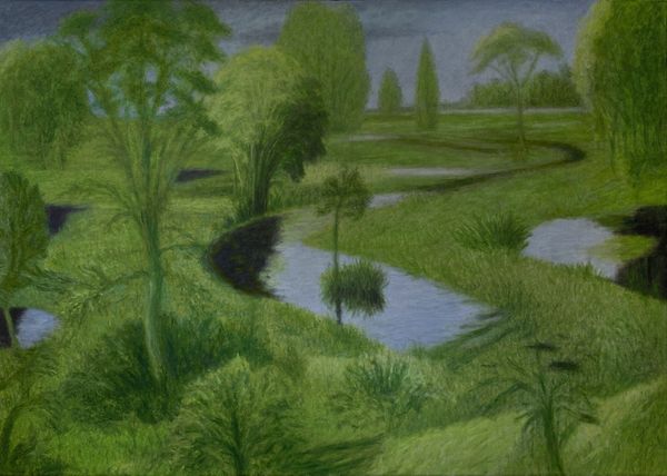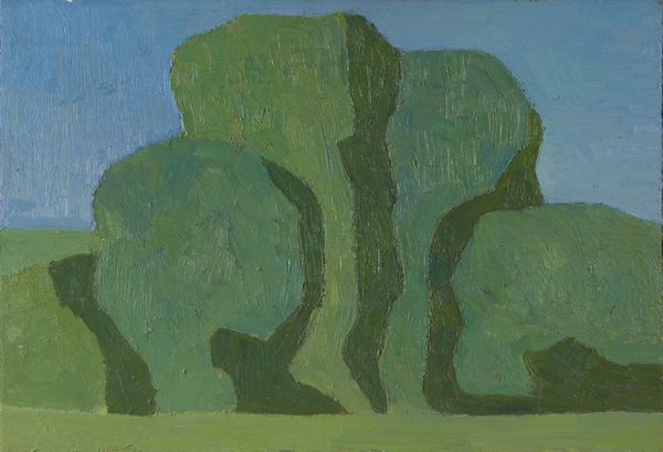 Editor: This is Eero Järnefelt’s "Sunset over a lake," an oil painting from 1894. It has this very still and calm feeling to it. I'm particularly drawn to the composition, how the islands are placed. How do you interpret this work through its form? Curator: It is rewarding to observe how Järnefelt employs formal strategies to convey atmosphere. Note the tripartite division of space: the chromatic intensity of the sunset yields to muted tonalities in the mid-ground and finally the almost monochrome foreground. This manipulation, coupled with the simplification of forms, results in a study in near abstraction. Would you not agree? Editor: I do. The simplification is interesting, and almost feels...modern. Do you see the verticality as playing a significant role, juxtaposed with the flatness of the lake? Curator: Precisely! The vertical format serves to emphasize the spatial recession, leading the eye into the painting and underlining the planar arrangement. Note also how the artist's brushstrokes become more gestural and visible in the lower portion of the canvas, further articulating the picture plane. Editor: So, focusing on the structure helps unlock so much about what he’s trying to convey through landscape. Curator: Indeed. By examining the formal elements, we can begin to understand how Järnefelt constructs meaning within the artwork, and move beyond a superficial reading of it simply as a landscape. Editor: I hadn’t thought of it that way, but now I see that focusing on form reveals so much more about his intent. Curator: Just so! And now hopefully you will view artworks through this new lens!
