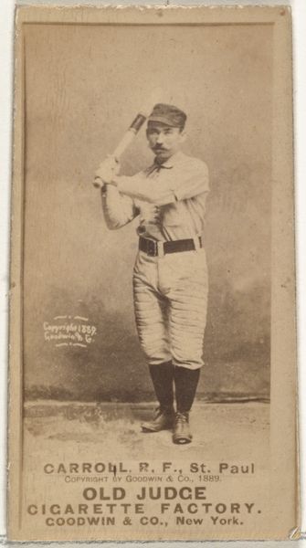 Editor: Here we have "O'Rourke, Center Field, New York," from the "Old Judge Cigarettes" series, produced by Goodwin & Company in 1888. It appears to be an albumen print, giving it this lovely sepia tone. What strikes me is how posed and almost classical the baseball player’s stance is. It reminds me of a Roman statue! How do you interpret this work? Curator: The image of O'Rourke, seemingly frozen mid-action, becomes more than just a baseball card. This frozen moment transforms him into a symbolic figure. The fact that it's tied to a cigarette brand amplifies the layers of meaning. It’s a symbol of Americana being sold, almost commodified. Editor: That’s a great point. It does feel very deliberate in its construction. Curator: Ask yourself, what did baseball represent at the time? Beyond just a game, it embodies notions of American identity, strength, and even masculinity. Then contrast that with a photograph on a card advertising cigarettes. Do you think that shifts the perception? Editor: I suppose the pairing suggests baseball and smoking are intertwined with that ideal of masculinity. Curator: Exactly! Images have always been utilized to convey particular notions of power, status, and belonging. Consider how icons become associated with those themes over time and how it relates to collective identity and aspiration. Editor: That’s fascinating, seeing how such a seemingly simple image is actually layered with meaning. I will definitely look at images in a new way now! Curator: Indeed, cultural artifacts always operate as visual language.