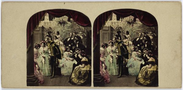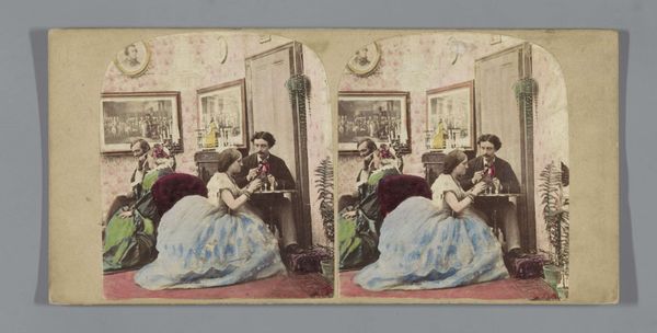 Curator: What immediately strikes me about this piece is the air of quiet industry surrounding a shared treasure, perhaps a collection of family heirlooms. Editor: Indeed. What we’re viewing is a photographic print titled “Vier meisjes en een jongen rond een tafel vol sieraden, op de achtergrond twee mannen,” dating roughly between 1850 and 1880 by Furne Fils & H. Tournier. It showcases a gathering around what seems to be a display of jewelry. I’m most drawn to the photographic process itself. It’s an albumen print, giving that unique sepia tone characteristic of early photography. Curator: The choice to highlight jewelry is interesting. It can signal not just wealth but legacy. Consider that jewelry can symbolize inherited power or the passage of tradition, carefully maintained in a time of upheaval. Editor: And what kind of labor produced such an image? Early photographic processes were highly technical and labor-intensive, a mix of chemistry and artistry. Think of the preparation of the glass plate negative, the precise timing of exposure… each print was a unique artifact born from a specific, skilled practice. The tangible, almost textural feel of the print suggests it isn't merely a flat surface; you almost feel the weight of the materials and the artist’s labor. Curator: The presence of both young girls and a young boy adds an interesting layer, suggesting the transmission of societal values related to status and heritage to a new generation. There are those in the background as well, gazing down on them almost reverently. What's being looked at is not just beautiful things but symbolic history. Editor: Absolutely. It emphasizes the commercial aspect too: documenting bourgeois affluence and creating lasting material testaments through accessible reproduction. How could having likenesses made increase consumption for items like jewelry? I mean, this one shows them off nicely, doesn't it? Curator: That's an intriguing angle, the photograph as a social signifier, both for those depicted within it, and those acquiring the photographic print itself. It preserves a vision of decorum that has weight even for a contemporary audience. Editor: Precisely! When viewing artwork, I want to focus on how the making shapes meaning. Understanding it’s origins makes one consider access, skill, and intent—how each part reveals layers that the image strives to contain. Curator: Considering the historical period adds even further dimensions, so looking into these visual treasures with fresh eyes has shown its enduring appeal! Editor: And for me, appreciating it comes down to the physical act and labor involved, turning something as simple as photographic printing into an art.