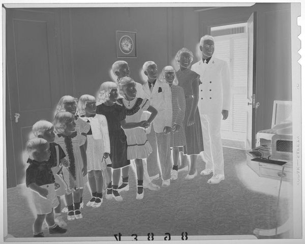 Curator: This photograph by Martin Schweig, currently titled "Untitled," captures twelve family members arranged by height. It’s quite striking, isn't it? Editor: Indeed! My first thought is how the stark contrast creates a slightly unsettling atmosphere. What strikes you most about this image? Curator: The ordered arrangement speaks to a deep-seated desire for structure, for placing each member within a defined hierarchy. It almost reads like a genealogical chart. Editor: And the material process – the photographic negative itself – contributes to this starkness. We see the emulsion, the very stuff of the image, shaping our view. Curator: Precisely. The reversal of tones gives the figures an ethereal quality. It's as if they are ghosts, emblems of memory frozen in time. Notice the clock on the wall? Editor: The very visible grain of the film reminds us of the material conditions of its making – the chemicals, the light. It's not just an image; it's an artifact of its time. Curator: Absolutely, a cultural relic. We see both the family's desire for posterity and the mechanical means by which that desire is manifested, layered like time itself. Editor: It certainly makes you consider how a seemingly simple family portrait involves complex techniques and represents more than just faces lined up in a row.