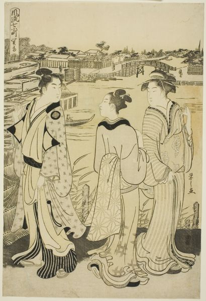 Editor: This is "Three Women Walking by the Lake" by Hosoda Eishi, a woodblock print created between 1793 and 1797. I’m immediately drawn to the elegant lines of the kimonos and the figures’ graceful postures. How does the choice of this medium, this specific printmaking process, impact our understanding of the piece? Curator: Well, focusing on the materiality, we can see that woodblock printing allowed for mass production, bringing art to a wider audience beyond the elite. How do you think that affected the subjects chosen for these prints? Editor: I imagine it democratized art in a way. Did this wider availability affect how women, especially those depicted here, were perceived or consumed as images? Curator: Absolutely. Consider the labor involved: the artist, the carver, the printer – each contributing to the final product. These weren’t unique paintings but crafted multiples reflecting and shaping social values related to femininity and leisure. How do you read their clothing and setting in terms of status or societal roles? Editor: The detailed patterns and refined hairstyles suggest a certain level of affluence. I wonder if the commercial nature of these prints further commodified women’s images and identities? Curator: Exactly. This form allowed images of idealized womanhood to be circulated, shaping perceptions and potentially fueling consumerism. This isn't just a snapshot of reality; it's a product within a specific social and economic framework. What have you learned thinking about it from this materialist lens? Editor: I hadn't really considered how the printmaking process itself impacted the content and the cultural context, but it is essential to understand the production as a reflection of the cultural and economic environment of the time. Curator: Right! By analyzing the material conditions, we uncover a richer, more nuanced understanding.