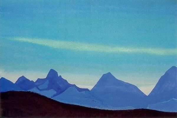 Editor: So this is Nicholas Roerich’s “Kangchenjunga” from 1937, a watercolor painting. There's something ethereal about it, a sort of layered, dreamlike quality. How would you read this artwork? Curator: Focusing on Roerich’s artistic practice here, it’s critical to consider watercolor as more than just a medium; it’s a choice reflecting a specific process and materiality. The transparency and fluidity, coupled with the subject matter of Kangchenjunga, invite consideration of the labor involved in its creation and circulation. Where do we see evidence of cultural consumption or specific labor practices embedded within its visual presentation? Editor: That's a perspective I hadn't considered. I was mainly focused on the spiritual themes usually associated with Roerich's landscapes. Curator: But even those themes are material! Think about the pigments used. Are they locally sourced or products of global trade networks? What social structures enable Roerich to create and disseminate this vision of the East? Consider that Orientalism is embedded into the choices regarding colors, representation of landscape and its use by specific audiences. Editor: So, instead of just seeing a romantic landscape, you are asking us to consider how this painting functions as a material object, influenced by trade and the cultural values of its time? Curator: Exactly. And further, how does its existence and accessibility shape and get shaped by labor? The paper, the pigments, even the water… everything is tied to systems of production. Who benefits, and who is exploited in bringing this image to us? Editor: That makes me think about the commodification of spiritual experiences. It's definitely shifted how I perceive the artwork. Thanks. Curator: Precisely! Considering artistic materiality provides concrete avenues for deconstructing prevalent mythologies related to spiritual enlightenment and/or fulfillment often surrounding exotic landscapes like Kangchenjunga.