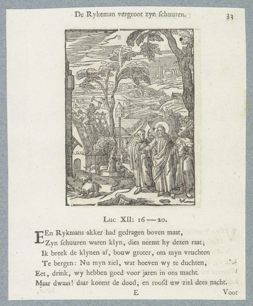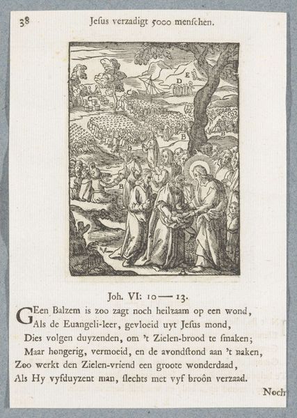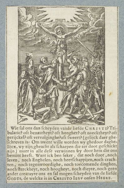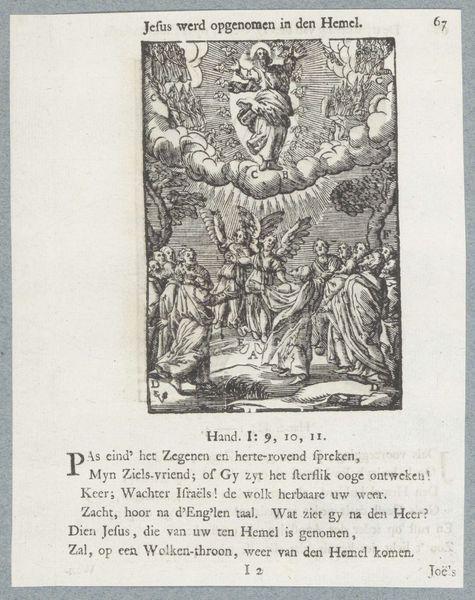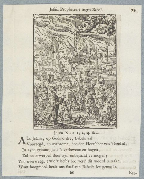 Editor: Here we have "Angels Holding Back the Four Winds," a print made between 1629 and 1740 by Christoffel van Sichem II. The level of detail, despite its small scale, is amazing. The overall effect is pretty intense, almost chaotic with so much going on. How do you interpret this work, given the artist’s choices in composition and subject matter? Art Historian: Indeed, a very active scene. Consider the historical context: religious engravings like this were frequently used to communicate biblical narratives to a largely illiterate population. Notice the number 4 and the "four winds." The imagery, drawing from the Book of Revelation, evokes ideas of divine control over natural forces and the promise of salvation amidst chaos. Do you recognize any of the key symbols being represented here? Editor: Well, I see angels, obviously, and wind implied through the billowing clouds. The text at the bottom seems related but I can’t read it very well. Are there other symbols I am missing? Art Historian: Look closely at what the angels are holding. Some have instruments that appear almost weapon-like. Others hold symbolic objects that recall their protective roles. These are visual cues that communicate power, restraint, and divine intervention. Also the seal that is mentioned in the text held by the "fifth" angel who is holding the winds to cause destruction on "noch Aarde, Zee, noch boom" until the seal can be given. Consider the engraving's function. Editor: That’s fascinating, so it's not just about depicting a scene, but encoding it with meaning that resonates with beliefs and fears of the time? It makes me consider its effect on the viewer at that time and to examine it beyond face value. Art Historian: Precisely. The lasting power of symbols is their ability to tap into the cultural memory. Studying art such as this helps us understand not only the past, but how certain symbols continue to resonate even today.