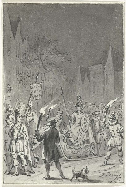 Curator: This drawing by Jacobus Buys, made between 1787 and 1789, depicts Karel V, the Holy Roman Emperor, receiving the keys to the city gates and the "roede van justitie" or rod of justice, of Utrecht. It’s currently held at the Rijksmuseum. Editor: My first impression is of constrained power. The gray ink wash gives everything a subdued, almost nocturnal feel. And that’s… paper? Quite fragile. Curator: Absolutely. The monochromatic medium does create an air of somber reverence, even if the event itself was surely grand. Think of the symbolism inherent in the keys and the rod. The ritual is all about transfer of power. Editor: The social context here seems so critical. Utrecht’s submission is a performance. You can feel the weight of the moment resting not on inherent divine right, but on political negotiations and material advantage. Who ultimately benefited from this display of authority? Curator: Precisely! It's about maintaining societal order through a visible symbol of transferred power, resonating even today in legal and governmental proceedings. Power visualized and made tangible. Editor: I can’t help but notice the quality of the line work, especially on the figures. Were these preparatory drawings? How many iterations existed before this one, each made with precious inks and paper? Labor lies embedded within this performance. Curator: Possibly studies for a larger history painting; Buys was a master of academic art. Think about the cost, both in materials and time invested, to create such works at the time. Editor: And that’s also true about the procession; that procession, and everything in it would be costly, particularly in these historical conditions. The carriage seems rudimentary in the backdrop as though de-emphasized with lesser detail.. Interesting details regarding this artist! Curator: Exactly! It adds layers to our understanding of power, from political maneuvers to aesthetic construction. Editor: It certainly does. Analyzing both the iconographic language and materiality reveals multiple facets of power and its effects in late 18th-century Utrecht. Curator: An impressive show, on many levels. I’ll look at history a bit differently from now on!