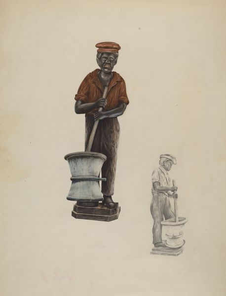 Curator: Harry Jennings' "Iron Hitching Post," circa 1937, renders a potent image with colored pencil and watercolor. My initial impression is one of stark, almost unsettling stillness. The figure, perched on that vivid green base, it almost feels frozen in time, or perhaps observation. Editor: The colors are certainly striking, almost discordant. Given the probable history of such lawn ornaments, what sociopolitical commentaries can we explore? The figure stands rigid and formal on the bright green pillar. It feels weighty, even burdened. The use of color only amplifies that reading. Curator: Absolutely. We can situate this piece within the landscape of American folk art and vernacular imagery. These "lawn jockeys," as they are sometimes known, were initially meant to depict enslaved African Americans as subservient. Jennings' work presents an opportunity to analyze the ongoing reverberations of such imagery within both history and contemporary cultural dialogues regarding representation and racial identity. What does it mean to represent such an image? Is it restorative, celebratory, or perhaps an exercise in documentation, to witness the life cycle of discriminatory objects? Editor: The symbol of the ring evokes both restraint and expectation, a complex and potent visual motif for the subjugation of a class. What resonates deeply is the object's transformation across generations; from object of racist nostalgia into an artifact scrutinized and recontextualized, sometimes even reclaimed as defiant statement of heritage by Black artists and communities. Is this an artifact that can ever be devoid of a dark narrative? Curator: It is difficult to detach it from that past. This illustration is a form of critical archiving. Jennings gives the figure its space, obliging us to look, consider, discuss and potentially, dismantle the enduring legacies of a discriminatory history that is also deeply coded in popular culture. This illustration, therefore, acts as an invitation to engage with painful yet vital histories. Editor: An object laden with shadows and unspoken stories, rendered into image... Jennings encourages us to reckon with the symbols, perhaps prompting us to seek a path beyond their painful origins and evolution. Thank you, curator, for adding important dimensions to my interpretation.
