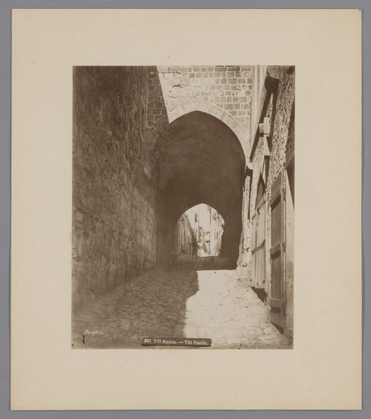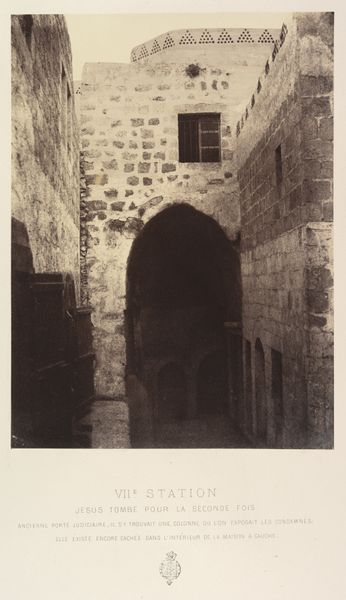 This albumen silver print by Louis de Clercq captures the IIe Station, where Jesus is laden with the cross. This photograph is more than a mere depiction; it evokes the profound emotional and historical weight of the Scala Santa. Notice how the unadorned stone wall rises, an architectural echo of the trials Christ endured. Consider the cross, unseen yet implied, a symbol of suffering that transcends its immediate religious context. This motif reappears across time, even in secular settings, where burdens of injustice or personal grief are depicted. The very act of bearing a weight, a cross, resonates psychologically, tapping into a collective memory of struggle. This isn't just religious iconography; it is a primal expression of the human condition, a recurring image in the theater of memory. This photographic moment captures a symbol that continues its cyclical journey, bearing the weight of history and the burdens of humanity.