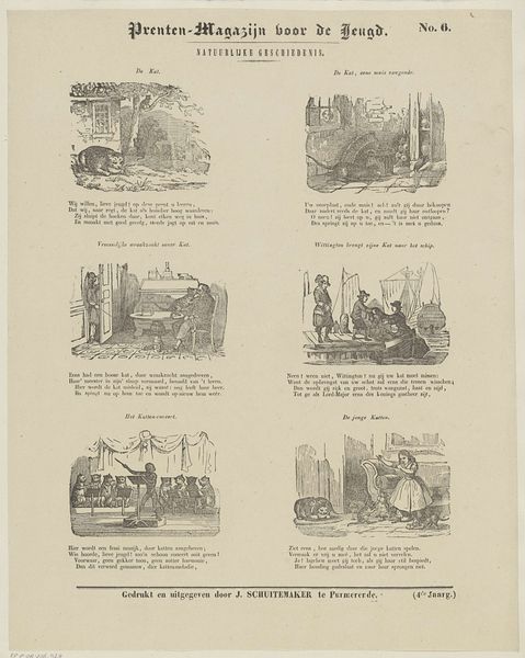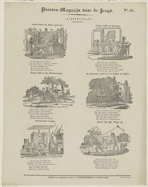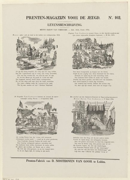 Curator: This print, titled "Voorstellingen uit de Hoeksche en Kabeljaauwsche Twisten," was created by Jan Schuitemaker in 1842. It seems to depict various scenes from historical conflicts, rendered in engraving. My initial reaction is that it presents a fascinating array of small narratives, each framed with such crisp detail for such an old engraving. Editor: Yes, it certainly has a quaint, almost storybook feel. What strikes me is how this "Prenten-Magazijn voor de Jeugd," magazine for youth, normalizes power struggles for its young audience, turning what must have been wrenching socio-political clashes into a series of digestible scenes. Are they really trying to make the normal violence fun or at least entertaining? Curator: That’s a potent reading. But perhaps the intent was less about glorifying conflict and more about instilling a sense of national identity and civic education through these very tangible and accessible means. Note the uniformity in production — paper, print, accessible language. The work highlights dissemination as much as content, perhaps creating a shared visual vocabulary for a wide audience, thus producing patriotism itself as the primary commodity here. Editor: That's interesting, but even then, think about the kind of national identity being constructed here. These Hoeksche and Kabeljaauwsche Twisten, they were struggles within the ruling class, and mostly concerning the role of Holland versus other regions. In other words, a very elitist origin to the “shared culture.” It completely omits the struggles of the working class, their experiences of labor, or their role in society during these conflicts. So, the engraving reinforces an accepted hierarchy. Curator: It seems clear we’re not meant to engage in revolutionary sentiment, or reflect too deeply on the means by which we were introduced to a society. What stands out to me now, with this new frame, is the incredible intricacy, the labor put into each tiny figure, each building, all to perpetuate an incomplete, some would even say manipulative, rendering of society for profit. Editor: Right! By focusing on the final image and not, as you say, all of that often obscured labour, you are simply continuing this project's erasure and subtle violence! That labour underpins not only the engraving, but all social realities in society! Curator: A chilling perspective to consider the engraving process under that light.