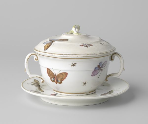 This terrine with a matching saucer, painted with butterflies and insects, was made in Loosdrecht, the Netherlands. Porcelain is such a fascinating material, often seen as precious, yet essentially made from humble clay. This piece speaks of refined taste, featuring delicate hand-painted insects. But think of the labor involved in creating this object. From mining the raw materials, to mixing the porcelain paste, to skillfully shaping it on a wheel, to firing in a kiln, the multiple firings necessary to create the painted decoration. The handle on top imitates intertwined twigs or leaves, while small gilded flourishes decorate the handles. The painter has also taken time to represent the insects, and the way that they animate the otherwise pristine white surface of the porcelain. In a world before mass production, making something like this terrine was a complex feat of teamwork, combining artistic talent with industrial processes. This terrine shows the complex interweaving of art, craft, and industry in the 18th century.