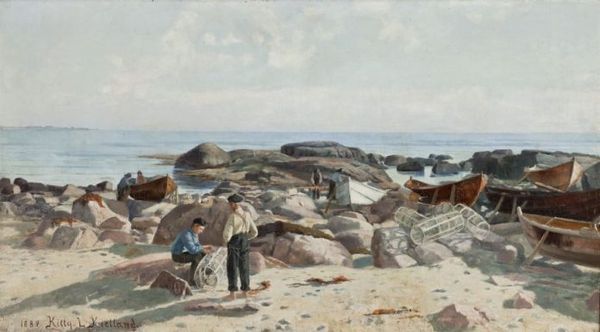 Curator: Look at this oil on canvas: William Collins' "Shrimp Boys at Cromer, Norfolk," created in 1815. I find it absolutely mesmerizing. The whole scene is suffused with a subtle melancholy. Editor: Yes, that initial impression definitely hits. There's a subdued palette at play here. Notice how Collins has orchestrated a balance between the cool blues and greys of the sky and the warmer tones of the sandy shore? Curator: Right? And that sky! It's like a turbulent poem hanging over everything. You feel like a storm might roll in any second to snatch away the carefree idyll. There’s a real sense of the sublime, isn't there? That overwhelming feeling of nature's power... Editor: I think so. Structurally, he's carefully balanced that expansive sky with the horizontal lines of the distant pier, and of the shoreline, too, of course, creating a solid foundation for the grouping of children. Curator: Absolutely! But look at their faces. They're almost luminous, like little beacons of hope. He's caught them at this fleeting moment of innocence amid a larger, harsher world. Almost allegorical, maybe? Are these figures really children, or miniature personifications of abstract concepts like family or society itself? Editor: Well, Collins was known for his genre painting, for these snapshots of everyday life. While the composition echoes a larger artistic dialogue that flirts with moral painting of its day, I think his focus is observational, less a heavy-handed symbolic discourse, and more the accurate rendition of light, space, and texture through color. Curator: Hmm. You could be right! Whatever his intention, I know this painting makes me nostalgic, thinking about summer afternoons spent with family. And I appreciate its painterly honesty. It reminds me how fragile and beautiful life can be. Editor: Indeed. It shows us something essential and very, very fleeting about an existence dependent on the sea and sand. It gives pause. Curator: Perfect! It certainly gives me pause.