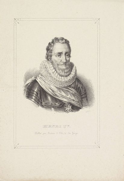 Editor: This is a portrait of Willem Lodewijk, Count of Nassau-Dillenburg, created sometime between 1834 and 1840 by the Monogrammist AVV. It's an engraving, so a print. I am immediately struck by the imposing nature of his armour and the intricate ruff. What do you make of this print? Curator: The armour and ruff are indeed central. They aren't merely fashion statements; they're loaded with cultural meaning. Armour speaks of power, status, and protection, but also of vulnerability, doesn't it? It implies a world where defense is paramount. Editor: That's interesting. I hadn’t thought about the vulnerability aspect. Curator: And consider the ruff, so meticulously detailed in the engraving. Think about what the circles signify. What might a closed-off circle symbolize in psychological terms, particularly around the neck, the seat of voice and expression? It acts almost as a barrier. Editor: Almost like he is consciously closed off. But what is the effect of pairing this ‘barrier’ with armour? Curator: It amplifies a sense of controlled presentation, perhaps even a performance of power. What feelings do you get from his facial expression? Is it one of warmth, openness, or something else? This contrast between protection and expression makes us ponder: What is he guarding? What part of himself is he keeping closed off from the world? Editor: The question of what he is guarding makes this print so much more layered. Thank you for that perspective. Curator: And thank you, that makes me consider the continued cultural relevance of such figures who need armour.
