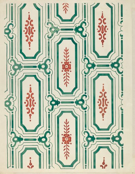 Editor: Here we have a textile sample, *Lynx*, by Josef Hoffmann. It's got this really interesting repeating pattern in a soft teal and cream. What draws your eye when you look at it? Curator: Considering Hoffmann's context, it's vital to look at this as more than mere decoration. How does the mechanization of textile production intersect with craft and artistic intention here? Editor: So, it's not just about the pretty design, but about the means of its creation? Curator: Exactly! The materiality of the textile, its potential for mass production, and its role in the broader social context of consumption all demand attention. Hoffmann's design choices reflect both artistic and industrial considerations, challenging the traditional separation between art and craft. Editor: That’s a totally different way of looking at it than I expected. Curator: Indeed. By examining the process and materials, we gain a richer understanding of the work and its place in society.