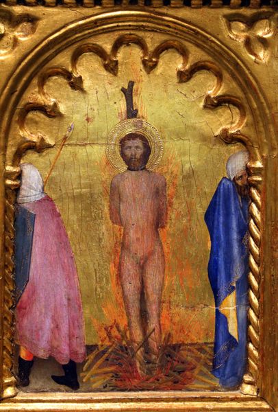 Curator: Here we have "The Man of Sorrows" by Michele Giambono, dating from 1425 to 1435. It is oil and tempera on wood. Editor: My initial response is one of intense sorrow, naturally, given the title, but also a real sense of the physicality of suffering. You see it rendered so viscerally. Curator: It’s interesting how Giambono presents Christ. "The Man of Sorrows" as an image had a specific role in religious devotion, particularly emphasizing Christ’s suffering as a direct result of humanity's sins. It invites empathy. Editor: I am curious about Giambono’s choices here. The medium itself - that blend of tempera and oil paints - suggests a careful, layered process, building up textures, but also impacting color, right? That pallid, almost translucent flesh. Curator: Absolutely. Giambono, working in Venice during the early Renaissance, inherited a tradition steeped in Byzantine art. Consider the heavy use of gold leaf in the halo – a symbolic marker of divinity, very much still present in this era. Yet, the emotional realism marks a departure from earlier Byzantine icons. The influence of the mendicant orders cannot be overstated either; the Franciscans, for instance, preached poverty and suffering. Editor: This smaller figure in the painting, is this Saint Francis then? He’s placed in shadow on the left. Note how the composition forces a vertical reading; a clear understanding of body position in painting is well communicated in a shallow stage. The materiality communicates grief with shocking effect for a presumed renaissance sculpture. Curator: It does. The framing narrative becomes important: where does it fit into Venetian devotional practices? How did its materiality inform viewers' understanding of this episode? Was it used privately? Editor: This sort of work is particularly compelling as it speaks to both incredible skill, and intense symbolic power with raw materials. Curator: It's fascinating how these artworks served both a deeply personal devotional purpose, and also reinforced broader social and religious doctrines of the time. Editor: Agreed, considering process alongside the devotional intent enriches the work tremendously for me.