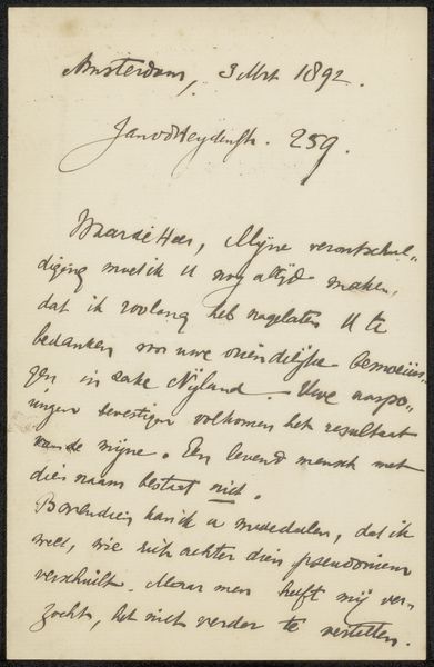 Editor: So, this is "Brief aan Jan Veth," possibly from around 1890-1892, by Willem Kloos. It's a pen and ink drawing, actually a letter. The handwriting gives it a really intimate feel, almost like peering into someone's thoughts. What do you see in this piece beyond just the handwritten text? Curator: You know, it whispers to me of Bohemia. It smells of pipe tobacco and unfulfilled manifestos. It's not just a letter; it’s a time capsule, wouldn’t you say? Imagine the quill scratching across the page, the lamp casting long shadows, another absinthe to lubricate a late night conversation... Can’t you feel it? That yearning, that Romantic rebellion, bottled in ink? Editor: I can definitely see the Romantic element. What was Kloos hoping to achieve, beyond the immediate message to Veth? Curator: Aha, the real question! Every stroke drips with the intensity of the *Tachtigers*, the Movement of Eighty, yearning to inject new life into Dutch literature and art. To awaken the senses! This letter becomes more than a mere request or update, it's a vital thread in the tapestry of their collective, and often chaotic, creative existence. Each word carefully chosen as a brick building their new era of artistry. Editor: It’s like a glimpse behind the scenes of a whole cultural shift. That's pretty amazing. I never thought of a letter as being such a revealing artwork. Curator: And isn’t it? Even seemingly mundane missives can pulse with the very lifeblood of art. Don't be fooled! They leave an echo from every artist and muse. It’s quite sublime.