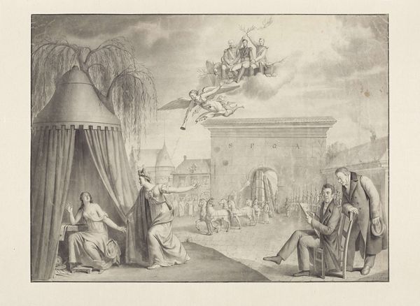 Curator: The scale of this engraving, John Martin's "Belshazzar's Feast" from 1826, is simply astonishing. It's almost cinematic, wouldn't you agree? Editor: Immediately! It has that foreboding sense of grandeur. The chiaroscuro effect, alternating radiant light with deep shadows, gives it an almost theatrical, stage-like quality. Like a nightmare unfolding on a cosmic stage. Curator: Martin was deeply interested in depicting cataclysmic events from the Bible. The story of Belshazzar’s Feast, as recounted in the Book of Daniel, concerns a king who profanes sacred vessels and is punished by a divine message foretelling his kingdom's demise. Martin exhibited it in London in 1826, at a time when biblical narratives were used to critique contemporary society. Editor: Look at the pervasive imagery. The Tower of Babel looming in the background… and on the opposite side the menorah which the Jewish King was meant to protect, this points to colliding religious forces. This is the clash of empires depicted on one terrifying page. And the figures reacting to the writing on the wall – a common image to suggest an unavoidable and unfortunate outcome. Curator: Absolutely, this reflects an anxiety about divine judgment and national decline during a period of social and political reform in Britain. Martin's audience would've certainly been aware of the decline of other empires, or thought they would meet such a fate. Editor: I wonder if those luminous beams can be read as anything more than mere light... It could be argued that its presence reinforces this as a scene from revelation itself. That kind of "divine light" as ultimate judgement and destruction, but that kind of apocalyptic image was certainly en vogue at the time. Curator: Martin found ways to capitalize on it. Mass print production brought works like this, laden with social commentary and anxiety, to a wide audience. It's easy to forget the effect this print would have had. To be surrounded by biblical painting after biblical painting could bring such narratives of past disasters and hold them up against British rule. Editor: It’s quite amazing to me how potent visual symbols, like that illuminated text, tap into deep wells of cultural understanding, even now, centuries later. Curator: Indeed. Understanding Martin's place within the socio-political discourse of 19th-century England gives us so much context to appreciate this artwork. Editor: I concur, examining his effective use of iconic and symbolic weight, enriches our interpretation and offers new perspectives.