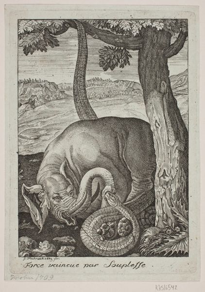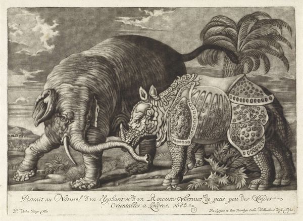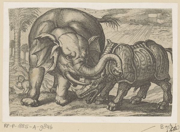 Editor: So, here we have Marcus Gheeraerts' "Gazelle, elephants and rhinoceros in a landscape" from 1583, an engraving on paper. I find it fascinating how he brings these very different animals together. But what jumps out at me is that the rhinoceros almost looks like it’s wearing armor. How do you interpret this work, seeing these exotic creatures rendered in such a peculiar way? Curator: It’s funny you mention the rhino’s "armor" – that’s often how they were perceived then! Remember, most Europeans hadn’t actually *seen* these creatures. This print wasn't about realism; it’s a window into a world of discovery filtered through Renaissance imagination. Gheeraerts probably relied on descriptions, sketches made by others, perhaps even taxidermied specimens if he was lucky. Editor: So, it's more about the *idea* of these animals than the actual animals themselves? Curator: Precisely! Think of it as visual poetry rather than a zoological record. The landscape too is rather generic, isn't it? Like a stage set. These exotic beasts were trophies, curiosities to be displayed and marvelled at. This image fed the European appetite for the exotic at a time when global exploration was booming, creating desire as much as it documented. I wonder, does the stiffness of these animals give you a hint of their being uprooted? Editor: That’s a great point! I hadn't thought of it that way. There’s a real sense of… detachment about them. More like symbols. It shifts my entire perspective of this work, as a portal into both zoology and colonialization. Curator: And there you have it – layers upon layers, interwoven. It's so great when art continues to engage, challenge, and reveal, centuries later, don't you think? Editor: Absolutely. Now I can't wait to apply all of these lessons to my paper on Early Modern Art. Thanks!