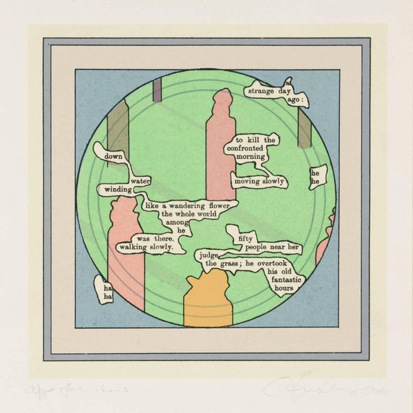 Curator: This intriguing piece is by Esq Tom Phillips, currently held in the Tate Collections. What strikes you first about this diminutive work? Editor: It feels like a half-remembered dream, or maybe a faded postcard from a place that never quite existed. The text fragments layered over those stripes... Curator: Yes, Phillips often uses found texts, isolating words and phrases, then layering them within a new visual context. The rhythmic stripes draw the eye and guide us through the scattered words. Editor: There's a tension between the formality of the stripes and the almost whimsical scattering of words. "Huge trunks and primroses" juxtaposed with "the old regime"... It’s quite evocative. Curator: Indeed. Phillips’s work invites us to create our own narratives, to find connections within the disjointed phrases. Each viewer constructs their own story, perhaps a memory triggered by a chance encounter with language. Editor: It’s a puzzle, in a very gentle, inviting way. Not a harsh riddle, but a whispered suggestion of meaning. Makes you want to linger. Curator: Precisely. And to let your imagination fill in the gaps.