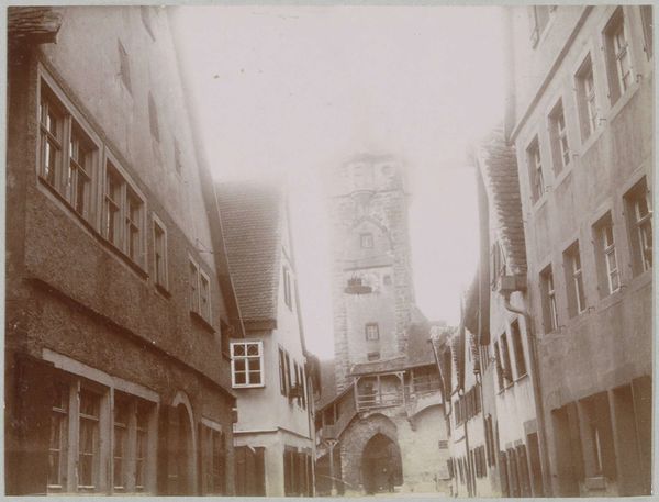 Curator: Before us we have "Trappenhuis en toren van het kasteel van Blois," or "Staircase and Tower of the Château de Blois," a photograph taken by Mèdéric Mieusement, sometime between 1880 and 1900. Editor: The sepia tones lend the whole composition a melancholic feel. The photograph feels less like a record and more like a staged theatrical backdrop with its interplay of light and shadow on the textured stone. Curator: This photograph invites us to consider the legacy of power and privilege embedded within architectural spaces. Blois, a former royal residence, was once the stage for immense political maneuvering. What stories do you imagine this architecture has silently witnessed? Editor: My eye is drawn to the receding diagonals of the staircase—the meticulous detail of each balustrade segment contributing to a layered and highly formal construction. The geometric precision offers a certain pleasure. Curator: Looking at Mieusement’s approach, I wonder what were his choices of perspective to frame this monumental architecture? How does the very act of documenting architecture intersect with the cultural values being impressed? Editor: Consider the textural contrast—smooth versus rough stone, for example. The gargoyles offer a counterpoint to the symmetry; their presence almost destabilizes the rigidity, no? Curator: Absolutely, this tension points to the larger themes in the history of France—a society striving for order, beauty and reason but grappling with social turmoil and revolution. The photo stands as a document to lost empires. Editor: Well, whatever socio-historical weight it bears, I admire how the photographer creates a complex interplay of shape and shade within a flattened picture plane. Curator: Examining photographs like these can unveil suppressed dialogues concerning heritage, colonization, and collective identity. It’s critical to reflect critically and ask probing questions about its significance. Editor: Perhaps, in its stillness, it captures the frozen architecture as pure design divorced from its social meanings—an autonomous form communicating solely through visual elements. Curator: Interesting. It seems we’ve found our points of connection and divergence on its function. Editor: Indeed. It’s this discourse around its layers that ultimately provides enriching insight.