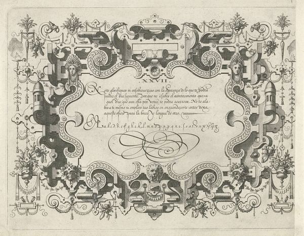 This “Ronde cartouche met maskers” was made by an anonymous artist, using an engraving technique. The material qualities of the print - the fineness of the lines, the precision of the details - speaks to the engraver's skill and the labour involved in creating such an intricate design. Look at the texture: the contrast between light and shadow, achieved through careful manipulation of the burin on the metal plate. The masks, foliage, and text are all meticulously rendered, creating a sense of depth and visual interest. This highly skilled process elevates the print from a simple design to a valuable cultural object. It reflects the social context in which it was produced, where printed imagery played an increasingly important role in disseminating information and ideas. The cartouche, with its decorative elements and classical motifs, speaks to the cultural values of the time, as well as new forms of mass communication. By considering the materials, making processes, and social context, we can begin to appreciate the full meaning and significance of this seemingly simple work.