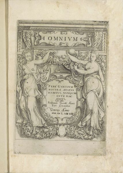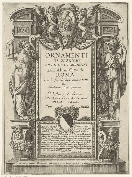 Curator: This pen drawing, etched with ink and engraved onto the print, dates between 1576 and 1618 and is titled "Titelprent met allegorische figuren en putti." Giovanni Maggi is credited as the artist, and we find it here at the Rijksmuseum. Editor: Right, an overwhelming composition! It immediately feels heavy, with those robust architectural frames weighing down the central text. You sense an intended gravity through the allegorical figures, don't you? Curator: Absolutely, and look at the elaborate nature of the engraving itself. Maggi painstakingly uses line work to build up shading and texture. This wasn't merely a reproduction process, but an act of skilled labour contributing artistic value. Editor: Indeed, this piece reveals a great deal about the cultural appetite for imagery during the late 16th and early 17th centuries. "Ornaments of ancient and modern buildings of the city of Rome..." tells us there was this fascination with the city as a seat of power and historical grandeur and those cherubic figures contrast the heavy framework, creating some appealing dynamic tension. Curator: Precisely, and consider who would commission and consume this. A wealthy elite, surely. Prints such as this, disseminated widely, served a crucial role in solidifying Rome's cultural and political standing across Europe, they show that consuming architectural ideas of Rome could take place everywhere through this medium. Editor: Which is so fascinating, given how Mannerism – the prevailing style at the time – actively sought to challenge conventional perceptions of perspective and proportion. Those figures seem almost crammed within their frames. Curator: That tension, I think, underscores Mannerism's pursuit of complexity over perfect harmony. By exaggerating the visual elements and overloading it with details, Maggi elevated the engraving from functional reproduction into something that approached an art object. Editor: Well, thank you for sharing this insightful materialist reading. The detail in Maggi’s choices shows this work in a new light. Curator: It seems that situating this piece in its time through an engagement with labour has, for me, enriched the piece even further.