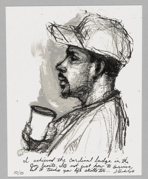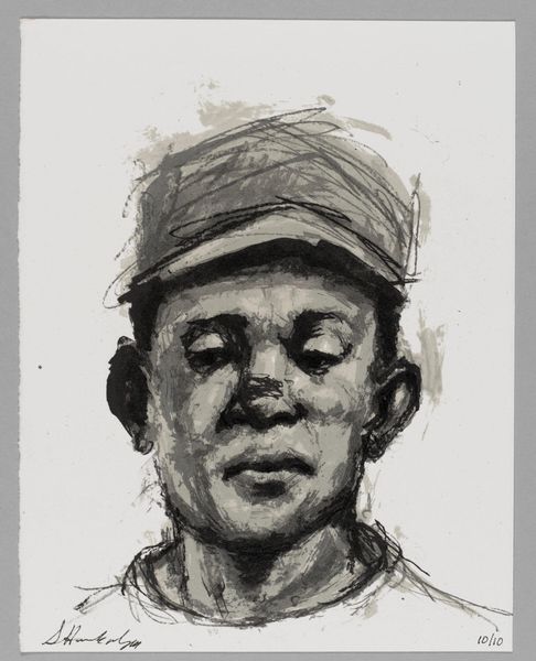 Editor: This is Sedrick Huckaby's "99% NO.39," a small portrait at the Harvard Art Museums. The stark black and white tones are really striking. What do you see in Huckaby's work? Curator: Note the emphasis on line and value. The artist's marks are clearly visible, highlighting the materiality of the medium itself. Consider how the contrasts create form and depth. Editor: So, it's more about the technique than the subject? Curator: Precisely. The subject is secondary to the artist's deliberate manipulation of visual elements. It is a study in form. Editor: I see how the composition itself tells a story, or at least asks a question. Curator: Indeed. It prompts us to consider the fundamental components of representation.