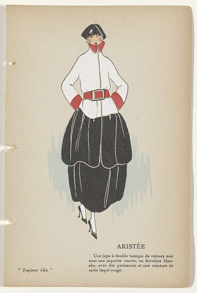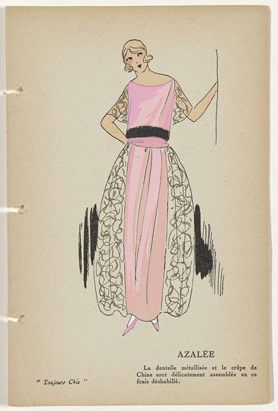 This fashion plate, Beryl, was made by G-P. Joumard in 1921-1922, and features gouache and pencil on paper. There’s an interesting dance between spontaneity and control here. The rendering is simplified, flat, and stylized, but with a focus on capturing the essence of texture and form. Check out the sharp lines that define the black cape. They create a sense of drama, almost as if the fabric is in constant motion. Then there's the fuzzy fur collar that feels soft and inviting. The vertical lines of the dress give a sense of elongation, a kind of visual rhythm. The color palette is restrained, yet effective; the pink and black feel modern and chic. This reminds me of Sonia Delaunay and the way she played with color and form in her textile designs, exploring the relationship between art, fashion, and the everyday. In the end, it all comes together to give us a glimpse into a specific moment in time, a conversation about beauty and style that continues to evolve.