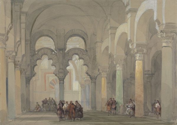Editor: So, here we have Martinus Rørbye’s "Interior of the Capella Palatina in Palermo, Italy" from 1842, rendered in oil on canvas. The light streaming in immediately captures my attention. What do you see in this piece, beyond the obvious beauty of the architecture? Curator: What I find particularly striking is the intersection of power and faith embedded within this space. Rørbye painted this during a time of growing national consciousness in Europe, and religious architecture often became a canvas for projecting cultural identity. This chapel, a blend of Byzantine, Norman, and Arab styles, speaks volumes about Palermo's complex history of conquest and cultural fusion. Editor: Fusion, definitely. I see all those cultural elements represented in the mosaics, arches, and even the clothing of the figures. How does that translate into identity and power? Curator: Think about who commissioned this chapel originally – the Norman kings in Sicily, who strategically incorporated elements of the existing cultures to legitimize their rule. Rørbye, in choosing to depict this interior, is also participating in a discourse about the “exotic” Mediterranean, often viewed through a colonial lens by artists from Northern Europe. Consider, also, who is given prominence in the painting, and who is relegated to the margins. Editor: That makes me reconsider the kneeling woman in the foreground. Is Rørbye perhaps framing her within a pre-existing, and maybe limiting, narrative of Sicilian piety? Curator: Precisely! How might her agency be diminished or amplified through his artistic choices? By understanding the social and historical context, we move beyond a purely aesthetic appreciation and start to analyze the power dynamics at play. Editor: It's like peeling back the layers of history embedded in the paint itself. Curator: Exactly. It transforms the way we look at art. Always consider context, and the conversations the art opens up, beyond the beautiful picture. Editor: I'll certainly carry that forward! Thanks for making me rethink my first impressions.