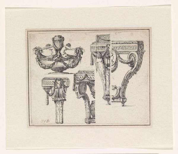 This detailed drawing depicts a design for a Gueridon, or small table, flanked by two ‘cul-de-lampes’, which are architectural ornaments resembling lamps, by an anonymous artist. Reflecting the aesthetics of its time, this design embodies the Rococo style, characterized by its ornate detailing and asymmetrical forms which moved away from the rigid symmetry of previous periods. The prevalence of such designs speaks to the era's focus on decorative arts and interior design, reflecting the lifestyles of the elite. The drawing also provides insight into the social hierarchies of the time. The elaborate detailing suggests that these objects were intended for an aristocratic clientele, thus underscoring the relationship between art, class, and power. While the identity of the artist remains unknown, their skill speaks to the complex network of artisans who contributed to the creation and dissemination of such designs. In considering this drawing, we might reflect on the historical contexts of luxury, artistry, and social stratification.