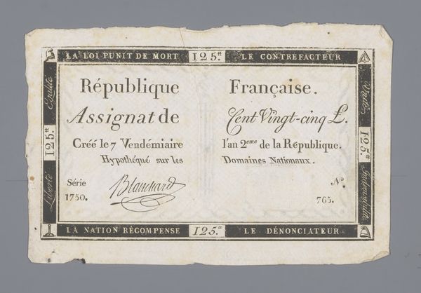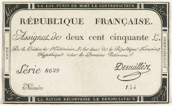 Curator: Welcome. Today, we're looking at an Assignat of Five Livres, series 20 I no. 31985 issued on May 6, 1791, though the production period extended for some time afterwards. This small printed note, likely an engraving, was created by Nicolas Marie Gatteaux. Editor: It strikes me as terribly fragile, even from a digital reproduction. You can almost feel the desperate hope pinned on such a small piece of paper amidst revolutionary upheaval. Curator: Indeed. Technically, its design adheres to neoclassical principles, note the symmetry, clean lines, and somewhat austere typography which communicate authority, while the engraving displays impressive detail for such a small object. Editor: But that very austerity feels loaded, doesn’t it? The promise of ‘Domaines Nationaux’—national lands— payable to the bearer masks the social and economic instability. The assignats were famously overprinted, fueling inflation and ultimately discrediting the revolutionary government. It reminds me of Foucault's discussion of power structures embedded within seemingly neutral forms. Curator: Interesting point. I see the neoclassical aesthetic as more than a mere facade. It’s an attempt to establish legitimacy through a visual language associated with order and reason, values the revolutionaries aimed to embody. The typography itself communicates the authority of the State. Editor: But at what cost? Widespread hunger and inequality continued as speculation ran rampant. The details within that decorative border don't resolve those contradictions. Curator: Agreed. Yet the abstract forms, divorced from narrative, aim to create a timeless statement of value. It’s a testament to the power of design to shape perception. Editor: Perhaps. Though I read that power as inextricably linked to the political and economic forces at play, a visual articulation of promises often broken, printed for mass circulation and rapidly losing worth. Curator: Thank you for illuminating its broader contexts. I've considered it solely from the position of a work intended to reflect clarity of form. Editor: A vital consideration, I wouldn’t deny. The print encapsulates the complex dynamics of a society undergoing radical change, its fragility belying the weighty historical forces it represents.