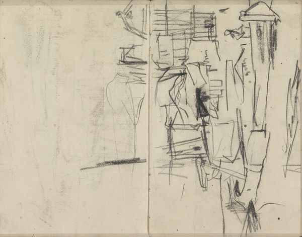 Curator: I’m struck immediately by the frenetic energy. It's almost like the drawing is vibrating! Editor: Indeed. What we’re looking at here is “Vrouw achter een rijtuig,” or “Woman Behind a Carriage,” a pencil drawing from around 1895 to 1898 by George Hendrik Breitner, housed right here at the Rijksmuseum. It is so immediate. The loose sketches, combined on these open pages... it breathes life! Curator: It’s clearly a study, isn't it? Capturing a fleeting moment. Look at the swift, assured strokes describing the carriage wheel on the left, and then juxtapose that with what seems to be clothes hung across what is probably a simple, straight chair. Editor: Yes, but Breitner's style isn't just about recording reality. The rough execution evokes a certain loneliness, I think. Or perhaps weariness? See the heaviness in those darker patches on the chair and the carriage... The carriage feels stranded. Curator: Perhaps, though I tend to see it as dynamic—the asymmetry, the varying pressure of the pencil...it suggests constant movement. The impressionistic capture feels like he wanted to illustrate how light changed those basic materials on the spot, like a painter in his plein air period. He might have paused there for just a minute before the driver urged on his horses. Editor: Light changes it but that is hardly the whole intention here! One could see those varying pressures also creating the very structure itself. Curator: Structuring an instant, really, wouldn't you say? Not structure in any monumental sense, but the momentary geometry of urban life. And Breitner captures the melancholy feeling it generates! Editor: It does capture a fleeting view, one that almost no longer exists except inside drawings like this one. Curator: A good place to preserve them, inside of a place of monument. What do you think, ready for coffee? Editor: By all means. After that brief flash of city life through Breitner's eyes.