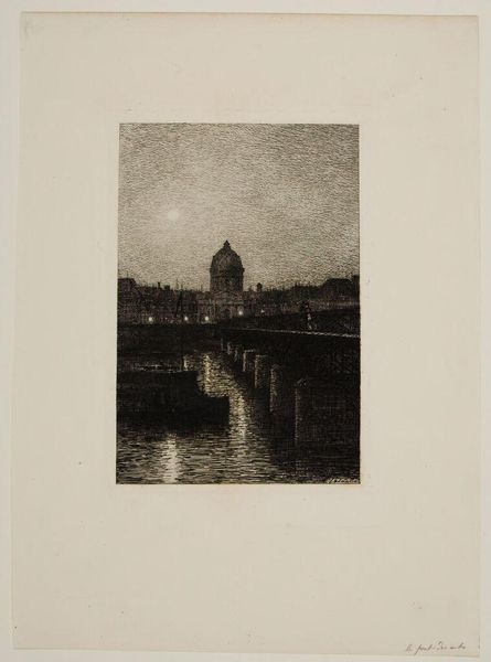 Curator: This is François Maréchal's "The Meuse," an etching from 1893, held here at the Minneapolis Institute of Art. Editor: My first impression is just how deeply nocturnal it feels, all soft charcoal tones and shimmering reflections. It feels hushed. Curator: The etching process really lends itself to that mood, doesn't it? All those fine lines capturing the damp air and the oily reflections on the water... You almost feel the cold rising from the river. I find it so striking how he uses such a simple technique to evoke such atmosphere. Editor: Absolutely. Thinking about the late 19th century, these growing cities, particularly industrial hubs built around rivers, experienced radical shifts in social life, pollution and health—which often became breeding grounds for both utopian and dystopian visions of modern existence. It raises questions about visibility and marginalization, especially if we consider that Maréchal lived through tumultuous times marked by industrial unrest, revolutionary politics, and shifting class dynamics in Europe. The darkness almost conceals and protects these tensions... Curator: Hides them, perhaps? Or, in the way that memory often works, softening harsh edges? I imagine the city in 1893 must have been quite different to actually experience—rougher, noisier, more pungent. Editor: Indeed! The romanticism we perceive may stem from the softening gaze of time, our longing for simpler moments, but I would suggest Maréchal doesn’t shy away from offering us space for complexity in this portrayal of industry's shadowy footprint. Curator: It's true, isn't it, that we often imbue art with our own feelings, even our longings, layering them onto what's actually there. And those longings say as much about the present as about any purported past. But perhaps that is the role of memory after all: To connect. To allow understanding of a place like The Meuse through understanding of one's self. Editor: Absolutely. Maybe Maréchal is inviting us to reimagine our relationship with nature and the built environment—or maybe it’s as simple as observing the transient beauty in our ordinary world. Curator: Or just feel it, be within it, just like this. Thank you!