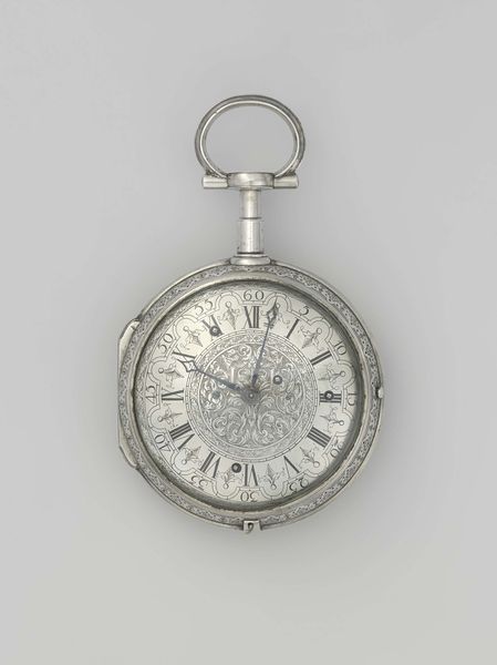Here we see a watch with a plain silver case, about 5 cm in diameter, crafted by Gerrit Bramer sometime between 1684 and 1770. The watch invites us to consider the social and cultural values that shaped its creation and its use. In the 18th century, the ownership of such a watch would have been a privilege, reflecting social standing and wealth. It speaks to a culture deeply engaged with emerging scientific thought and a desire to measure and control time. What does it mean to possess time, and how does that possession affect one’s identity? Consider how the intricate design and precious materials contrast with the utilitarian function, blurring the line between art, science, and status. Notice how time becomes an object of beauty, a testament to human ingenuity, but also a symbol of power and control. This piece prompts us to reflect on the complex relationship between time, identity, and social status.