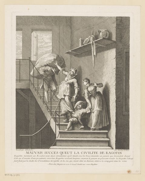 Curator: Welcome to the Rijksmuseum. We’re standing before "Ram valt slapende Ragotin aan," which translates to "Ram Attacks Sleeping Ragotin." It's an engraving by Gabriel Huquier, created sometime between 1705 and 1772. Editor: My initial reaction is that this print is chaotic and whimsical. It’s full of surprising, almost absurd, juxtapositions—a monkey hanging from a beam, a caged bird overhead, and this rather violent ram confronting a sleeping figure. Curator: Indeed. The artist employs a sophisticated layering of lines and textures. Observe the detailed cross-hatching that gives form and depth to the figures. The formal balance between light and shadow guides our eyes, yet it is ultimately quite asymmetrical in its construction. Editor: But who is Ragotin, and why the aggressive ram? I see it as a social satire, a commentary on class, leisure, and perhaps the disruptiveness of nature itself. This scene almost depicts a cruel game being played at Ragotin's expense, highlighting themes of power, spectacle, and potential exploitation of an individual who probably comes from lower status in life than everyone else in the room. Curator: Precisely. While the image's immediate impression may be one of jest, analyzing it through a more critical, political lens reveals complex commentary on hierarchies and societal norms of that era. Look at how the artist used frottage techniques on a very complex burin engraving medium, to produce the tonal contrast in areas such as the blanket on the back wall of the setting. This print cleverly stages disruptions both figuratively, with the rude interruption of this person's sleep by the ram, but the piece is physically a textural experiment! Editor: Absolutely. And that monkey dangling overhead... it could represent untamed desires or suppressed behaviors within a restrictive social structure. It creates a sense of unease alongside all the apparent frivolous activity. It's worth acknowledging the work might normalize the kind of raucous play happening here that's clearly going to inflict some kind of emotional distress. Curator: The baroque style lends itself to such multifaceted interpretations. A close look allows for continuous rediscovery. Editor: And by looking at art in many diverse ways, we better illuminate its ability to spark conversations around social dynamics then and now.