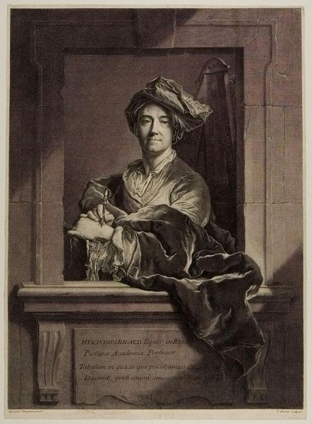 Editor: So, this is a portrait of Fridericus Benedictus Oertel by Georg Friedrich Schmidt, currently at the Harvard Art Museums. It has an interesting allegorical composition and I'm curious about the cherubic figure. What is your interpretation of this work, especially its cultural context? Curator: Considering Schmidt's time, portraits of this nature were often instruments of power. The inclusion of the cherub, and even the architectural frame, all contribute to Oertel's construction of an image: What do these symbols communicate about status, gender, and the role of knowledge in shaping societal hierarchies? Editor: That’s fascinating! I hadn't thought about the architectural framing as part of that power dynamic. Curator: Exactly. We must examine how art participates in these power dynamics to truly understand its impact and meaning in history. Editor: I’ll definitely be looking at portraits differently now. Thanks!