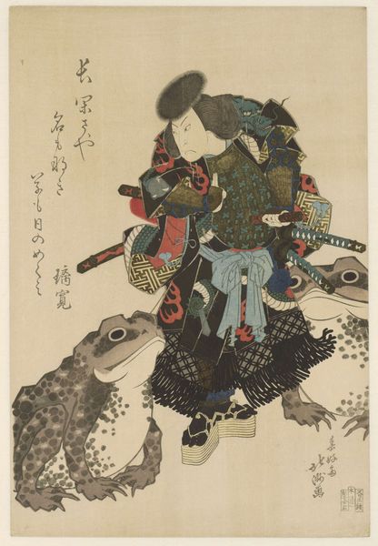 Curator: Here we have a fascinating turn-of-the-century woodblock print titled "(Monkey Costumed for a New Year's Dance)." Editor: My first impression is its strange blend of the playful and the grotesque; the sharp angularity of the monkey's pose contrasts wildly with the flowing text, while the flatness almost exaggerates the fur. Curator: The print offers insight into the complex relationship between humans and animals in Japanese society at the time. In Japanese culture, monkeys were viewed through the lens of folklore, sometimes seen as divine messengers and sometimes as comedic figures. Here, dressed in what seems to be theatrical garb, the monkey takes on a human persona. Editor: From a purely visual perspective, the layering of textures—the monkey's fur against the plaid pattern of the kimono—adds to its striking character, while that single red detail at the upper right gives it balance. Can you read any of the characters for us? Curator: This caricature probably reflects societal anxieties and maybe even subtle commentary about social hierarchies. Note the rigid black hat worn above the red cap—a potential symbol for restrictive customs as Japan continued its rapid modernization and navigated its role among colonial powers at that time. This is quite fascinating. Editor: I notice the deliberate economy of line. How the artist captures so much detail, movement, and perhaps subversion with just ink, color and paper. Look, too, at the tension between line and color. There's no color within those inscribed lines, just around them. Curator: Precisely. Also note how Japanese New Year's festivals often featured performances where animals or people in animal costumes challenged the traditional expectations surrounding these celebrations. We could argue that through this caricature, traditional norms were being subverted and negotiated. Editor: Thinking about the use of woodblock print—how the act of carving and printing creates this distancing effect, and perhaps enables even sharper cultural observations than, say, paint. The physical constraints are themselves revealing. Curator: Absolutely. It encourages reflection about who defines "normal" and how culture adapts and shifts its perception. I see now that these images play vital roles in exploring the dynamics of human behavior through costumed, animal characters. Editor: This has led me to view its textures as metaphors for cultural forces; those carved, deliberate shapes speak to that critical push and pull in Japanese identity at the time. Thank you!
