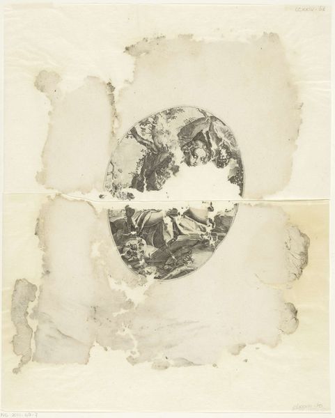 Curator: I’m struck immediately by its fragility. It appears so delicate. Editor: Indeed. Here we have an ink and pencil drawing entitled "Maria Magdalena," dating from between 1582 and 1590. Its artist is, alas, unknown. It resides here in the Rijksmuseum. Curator: The splotches around the central image almost make it seem as though the image is emerging from water, or being consumed by it. A bit like something barely recovered from history itself. Editor: Precisely! Consider the figure of Mary Magdalene herself. She often symbolizes repentance, redemption, and the confrontation of sin. The fragmented quality here visually echoes the shattered past she leaves behind to embrace her faith. The abstract style further underscores the struggle and ambiguity of personal transformation, a universal idea represented here by Maria Magdalena, but also a direct connection to form. Curator: Do you think the artist purposefully created the effect of damage and fading, or is that just time taking its toll? Because it truly enhances the symbolism if intentional. What I am seeing is not a complete human form or idealization of Maria Magdalena, rather an evocative suggestion, that points to larger institutional issues about female representation. Editor: Well, the application of ink seems deliberately uneven, doesn't it? There's a real sense of contrasting precision in the central form with those almost ethereal surroundings. Curator: It speaks volumes, doesn't it, about how memory and religious figures are constantly being reshaped by cultural forces? What we choose to remember, what we choose to forget… Editor: Yes, it’s a powerful testament to the ongoing cultural construction of identity, both individual and collective. Seeing such a drawing lets one consider our own engagement with images across history. Curator: For me, this particular image has unlocked so many layers. Thanks for pointing those out. Editor: The pleasure was all mine, as always.